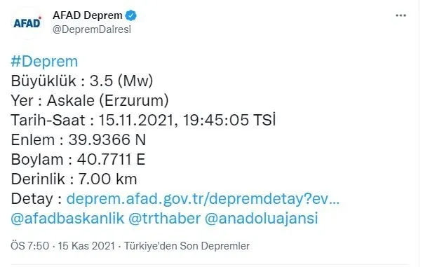 İki kurumun aktardığı verilere göre şiddeti 3ün ve 4ün üzerinde gerçekleşen deprem meydana geldi. Kandilli Rasathanesi ile AFADın aktardığı verilere göre 15 Ekim 2021 Cuma günü Burdur Akdeniz Antalya Kastamonu Ege Denizi Şanlıurfa Konya Denizli ve Çanakkale gibi bölgelerde hafif çaplı depremler yaşandı. İşte 16 Ekim 2021 Kandilli Rasathanesi - AFAD.