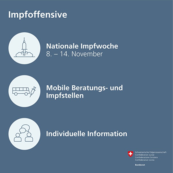 Bund und Kantone lancieren die nationale Impfwoche. Inhalt Nationale Impfwoche - So wollen Kantone Ungeimpfte doch noch überzeugen. Die Impfung bleibt das wirksamste Mittel um die Pandemie in der Schweiz zu beenden.